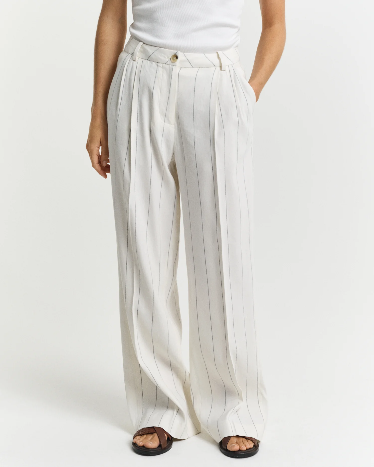 These summer pants are crafted from a lightweight blend of European flax linen, certified viscose and a touch of comfort stretch. Cut for a relaxed fit, they have a mid-rise waist and a straight leg. Elevated with an all-over pinstriped design, these pants are complete with belt loops, front pleats, front slanted pockets, back welt pockets, and a button and zip fly closure at the front.